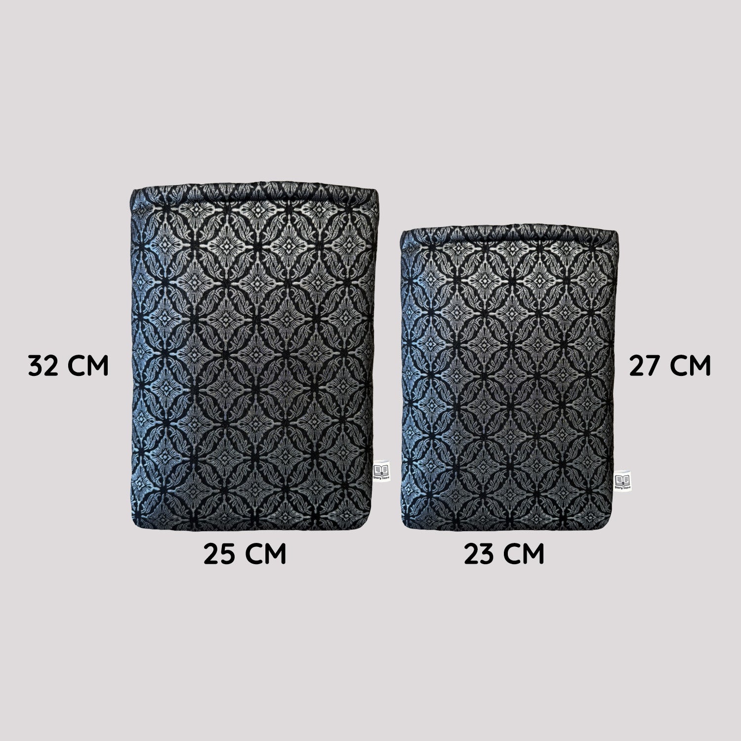 De Book Sleeve Zwarte Roos straalt elegantie en mysterie uit met haar sierlijke barokke patroon in zwart en zilvergrijs. Deze sleeve heeft een klassieke en tijdloze uitstraling die perfect past bij lezers die houden van een vleugje luxe. De binnenkant is gevoerd met een diepzwarte stof die perfect past bij de buitenstof. De vulling van 300 grams wattine zorgt ervoor dat je boek goed beschermd blijft tegen krassen, stoten en andere ongelukjes.